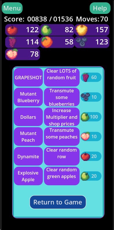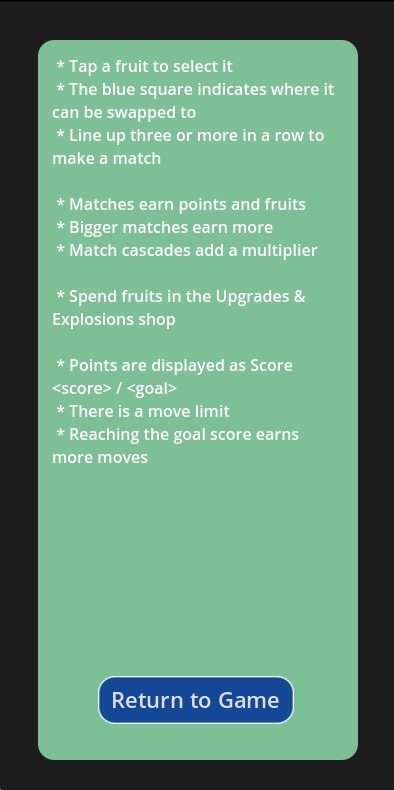 Match fruits to earn more moves! Cascade matches to earn faster! Use matched fruits to purchase even more matches!